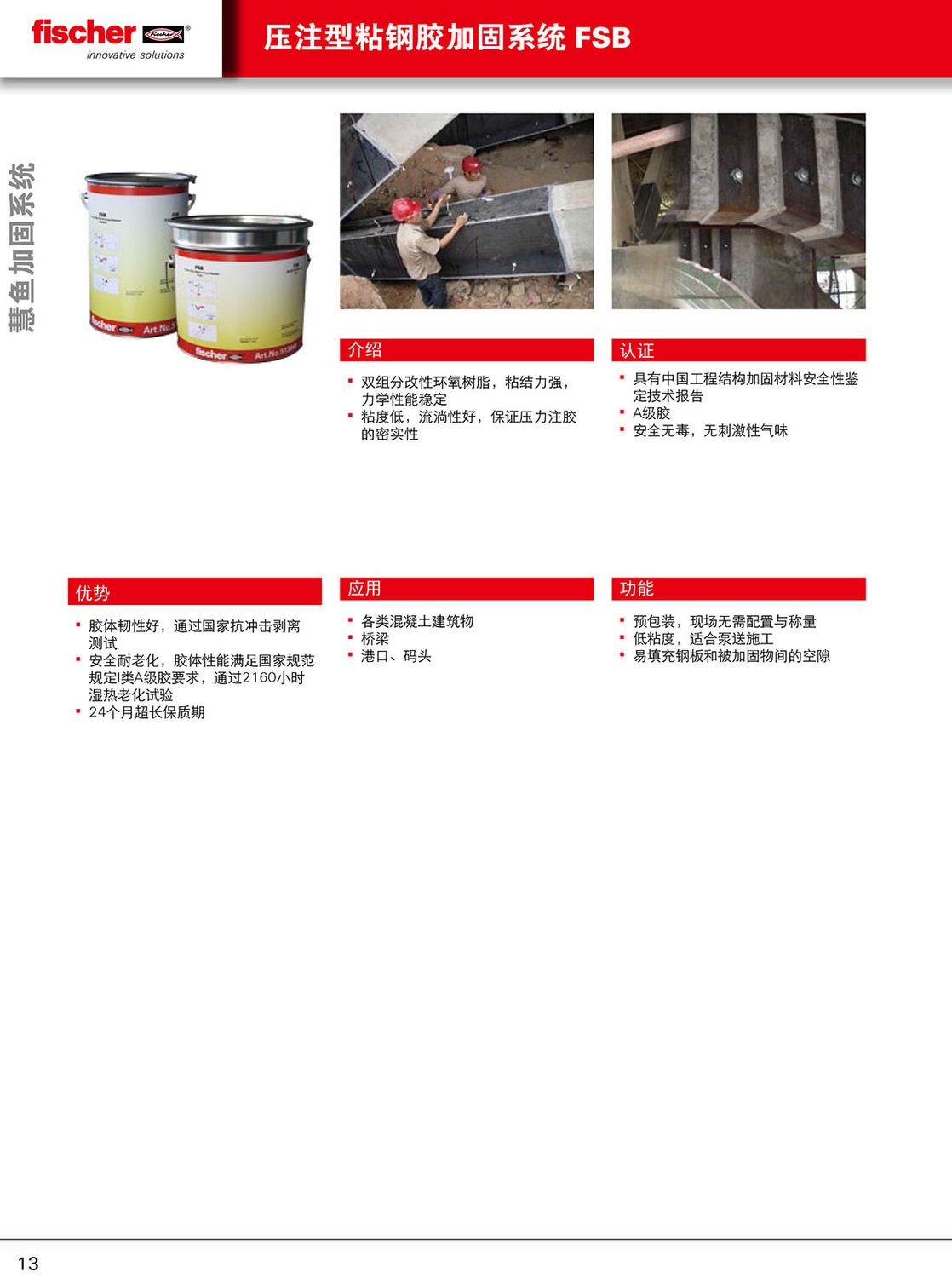 慧魚壓注型粘鋼膠FSB是歐洲體系,節(jié)省施工成本和施工時間; 膠體具有極佳的觸變性,便于涂
